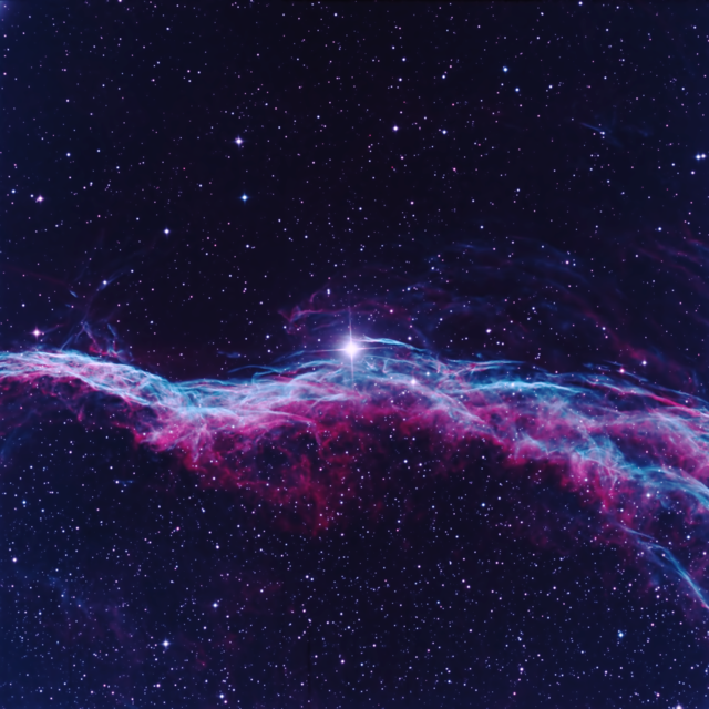 Three of the brightest complexes are the Bat Nebula (AKA NGC 6995; AKA the Eastern Veil), the Witch’s Broom (AKA NGC6960; AKA the Western veil) and the Pickering’s Triangle (AKA NGC 6979). These three photographs were taken using filters designed to enhance the glowing filaments of hydrogen: red and blue.